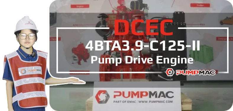DCEC 4BTA3.9-C125-II pump drive engine is a 4-cylinders in line, 3.9 liters four-strokes engine with 102 mm bore and 120 mm stroke. Equipped with Weifu PW2000 fuel pump and RQV-K governor, comes with turbocharger and Water-Air intercooler.