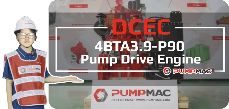 DCEC 4BTA3.9-P90 pump drive engine is a 4-cylinders in line, 3.9 liters four-strokes engine with 102 mm bore and 120 mm stroke. Equipped with mechanical fuel pump and electronic governor, comes with turbocharger and Water-Air intercooler.